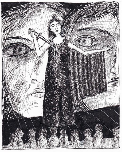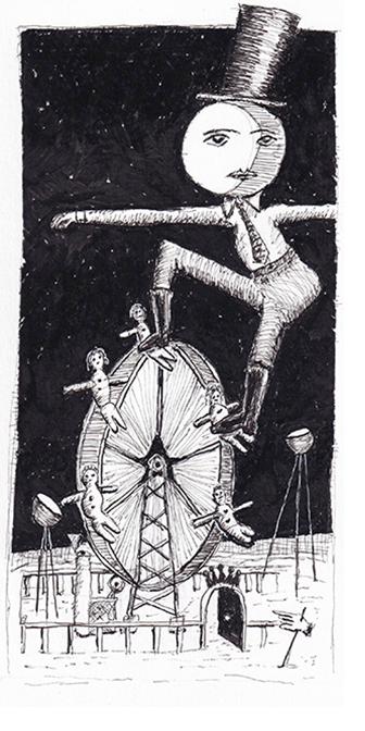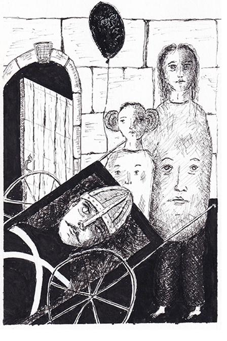 Black and white drawings of figures caught in vivid, uncanny situations.